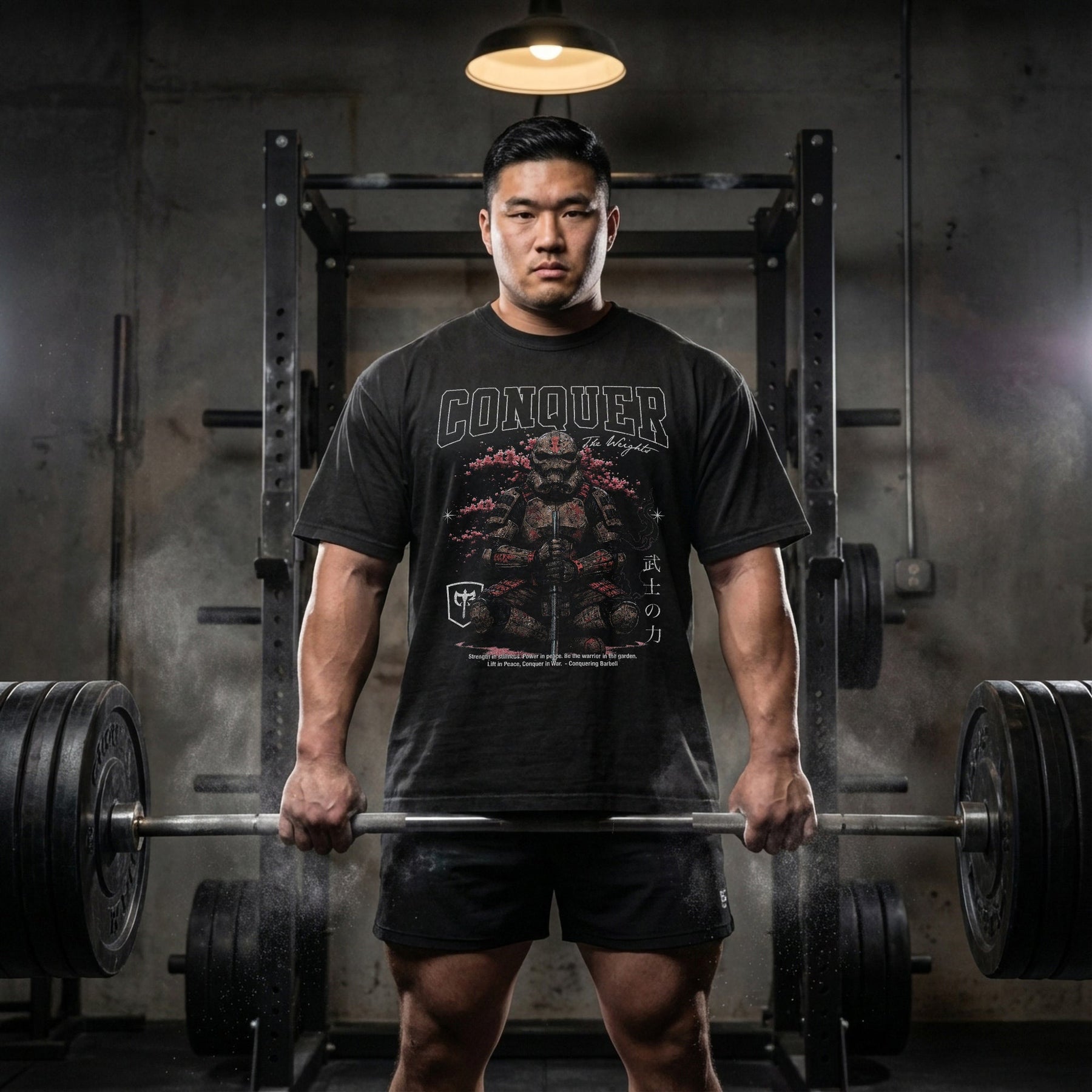 Design: Seated armored warrior with broken barbell, sakura backdrop, kanji accents, and CB crest; “Conquer the Weights” script and creed line