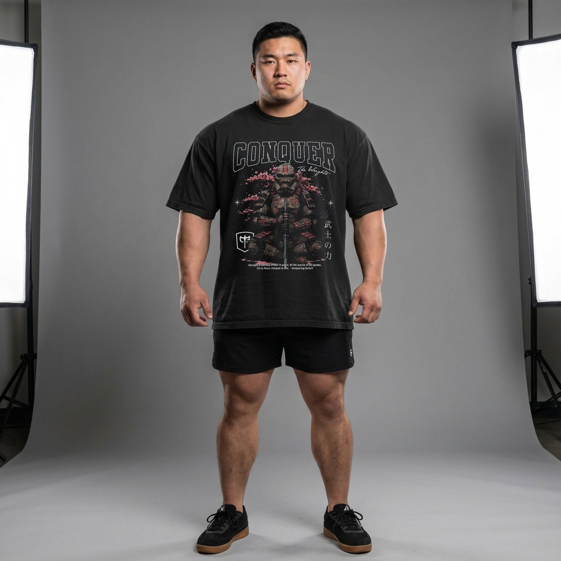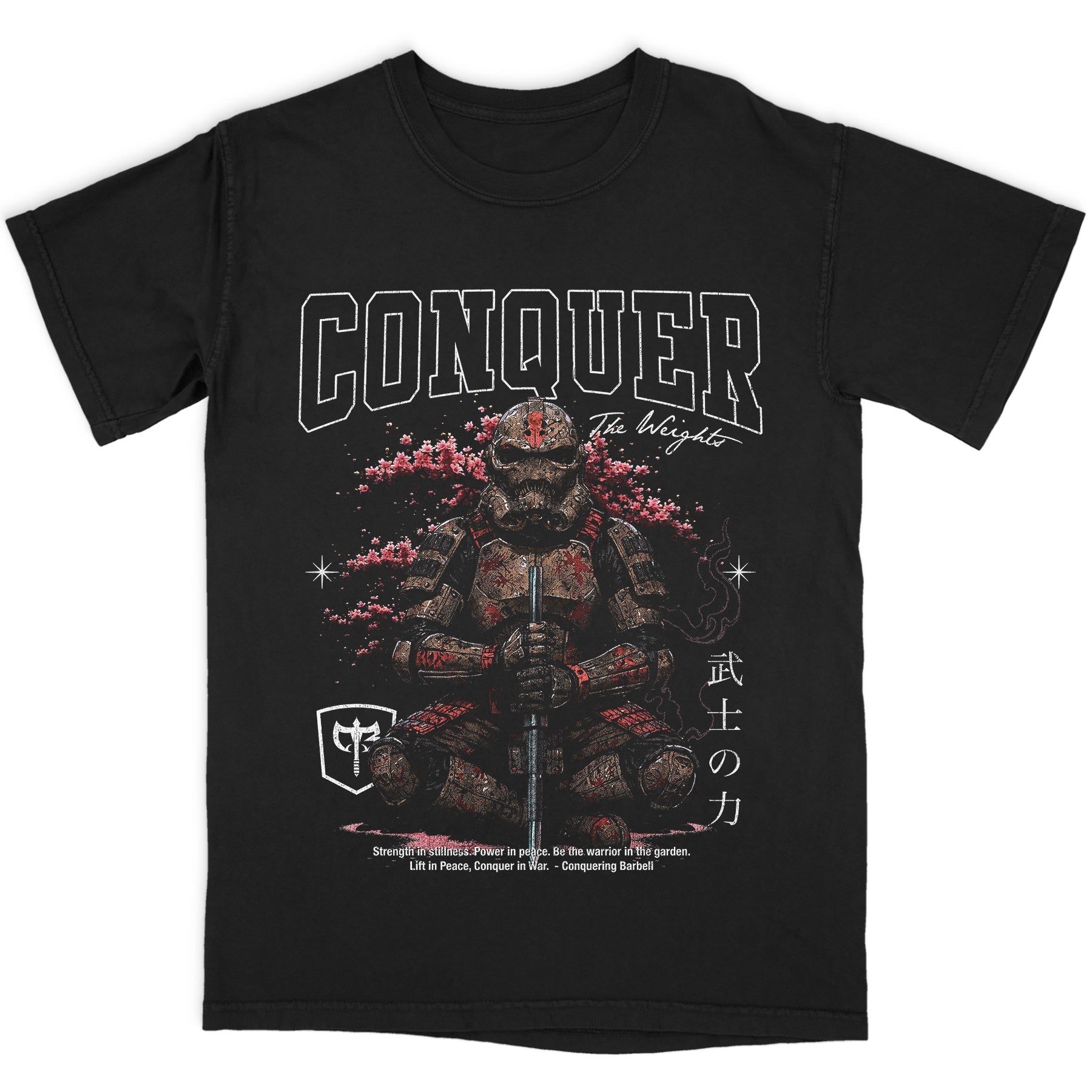 Strength in stillness. Power in peace. The Warrior in the Garden tee pairs an armored guardian meditating beneath cherry blossoms with a bold collegiate CONQUER headline—built for lifters who stay calm before they crush sets.
