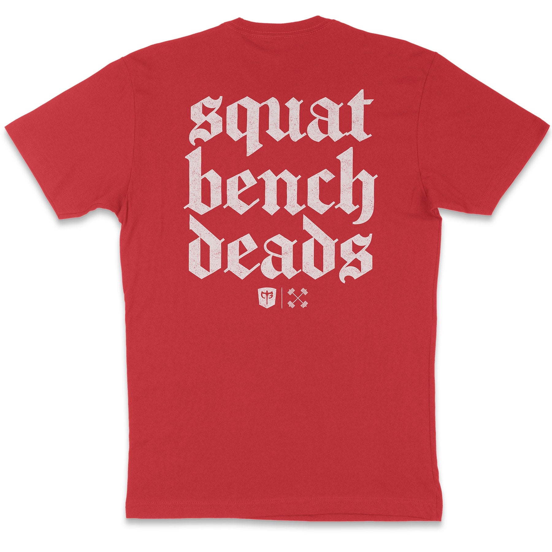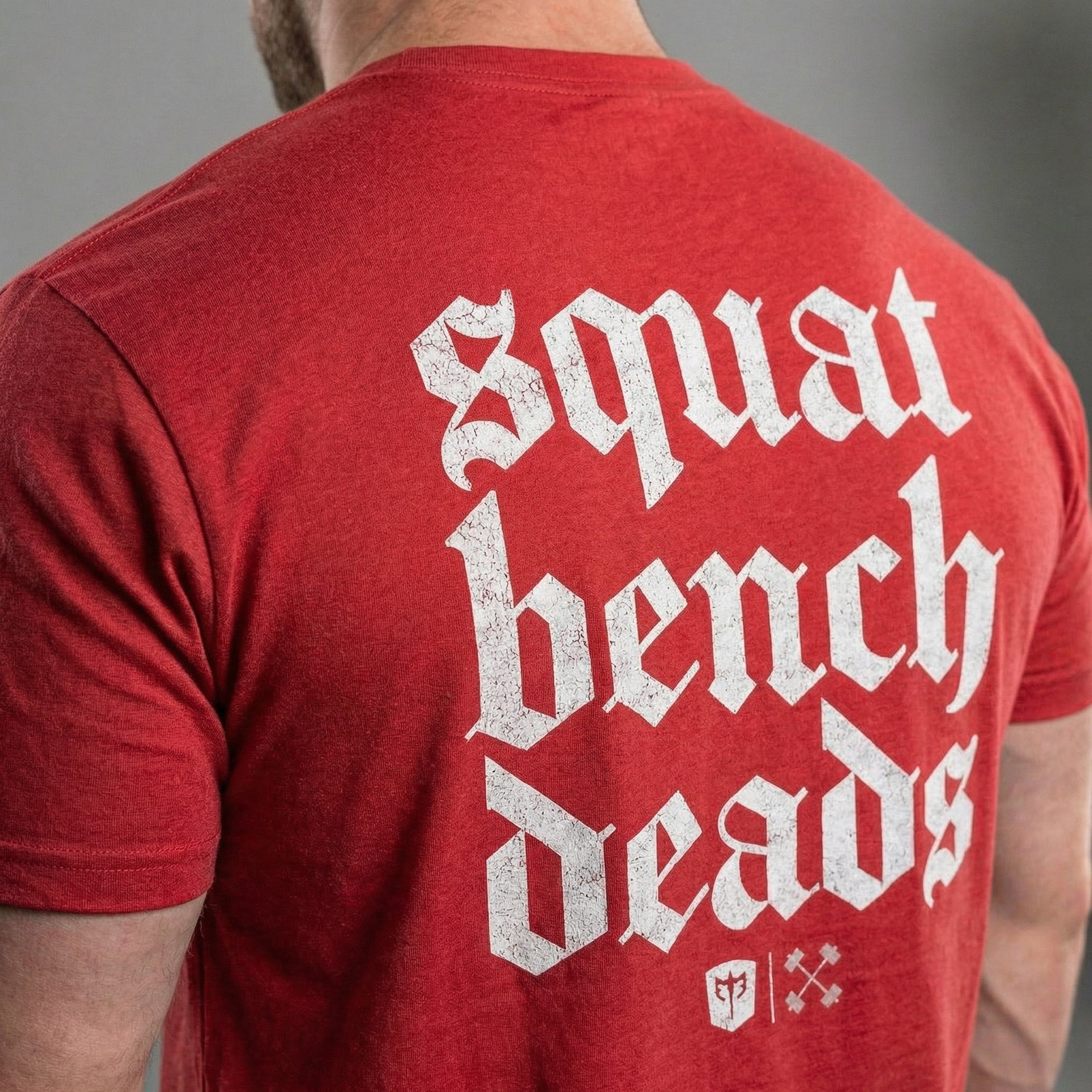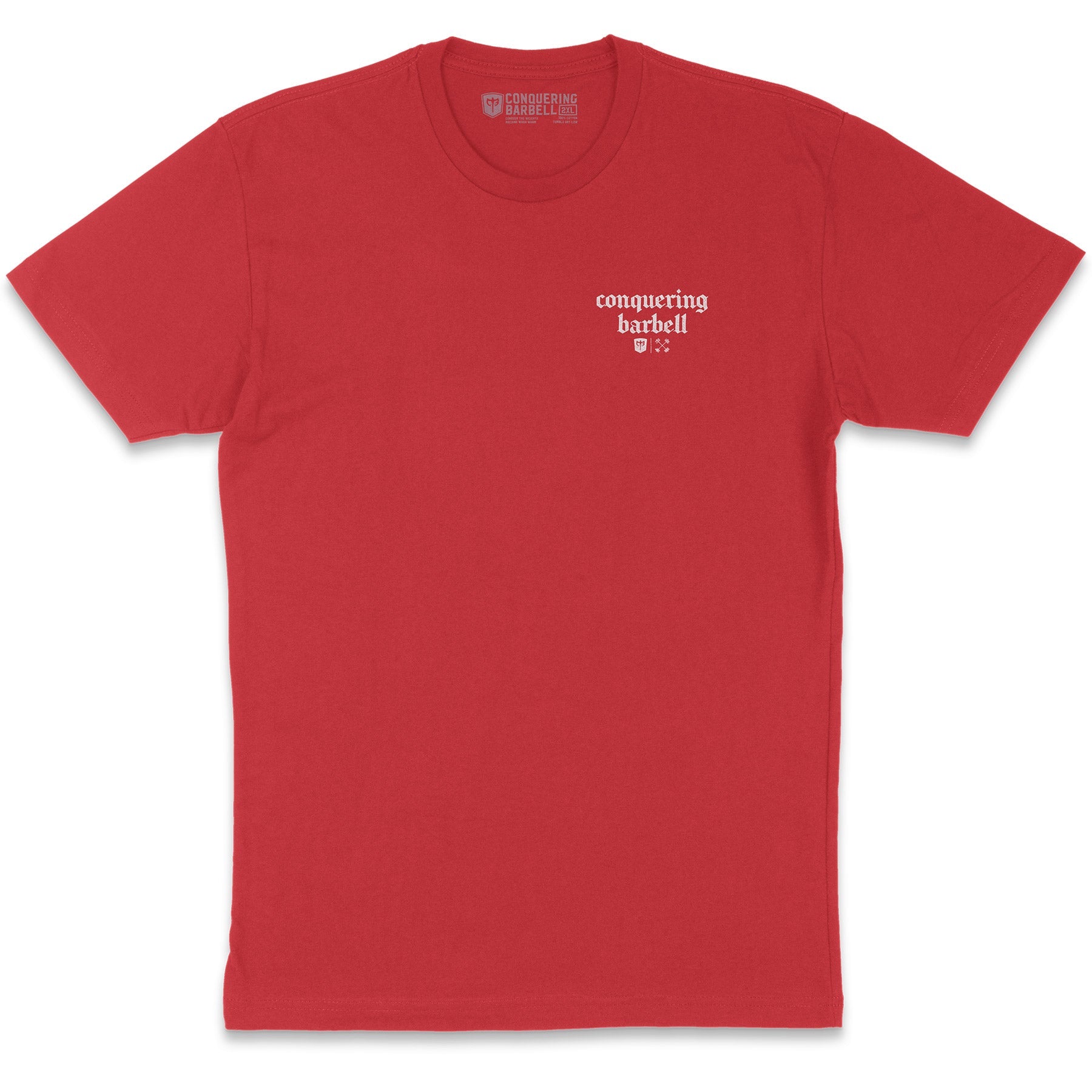 Squat Bench Deads on Red Tee - Conquering Barbell