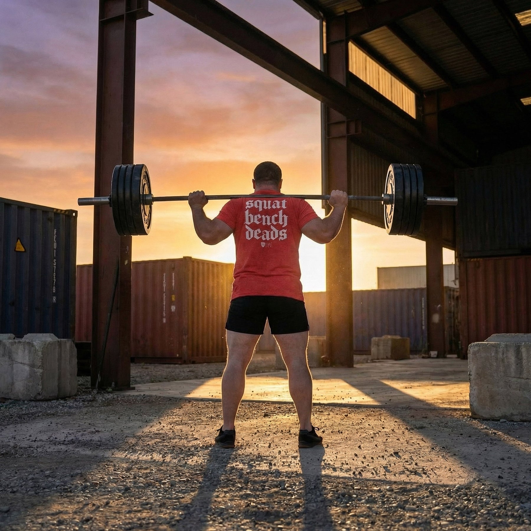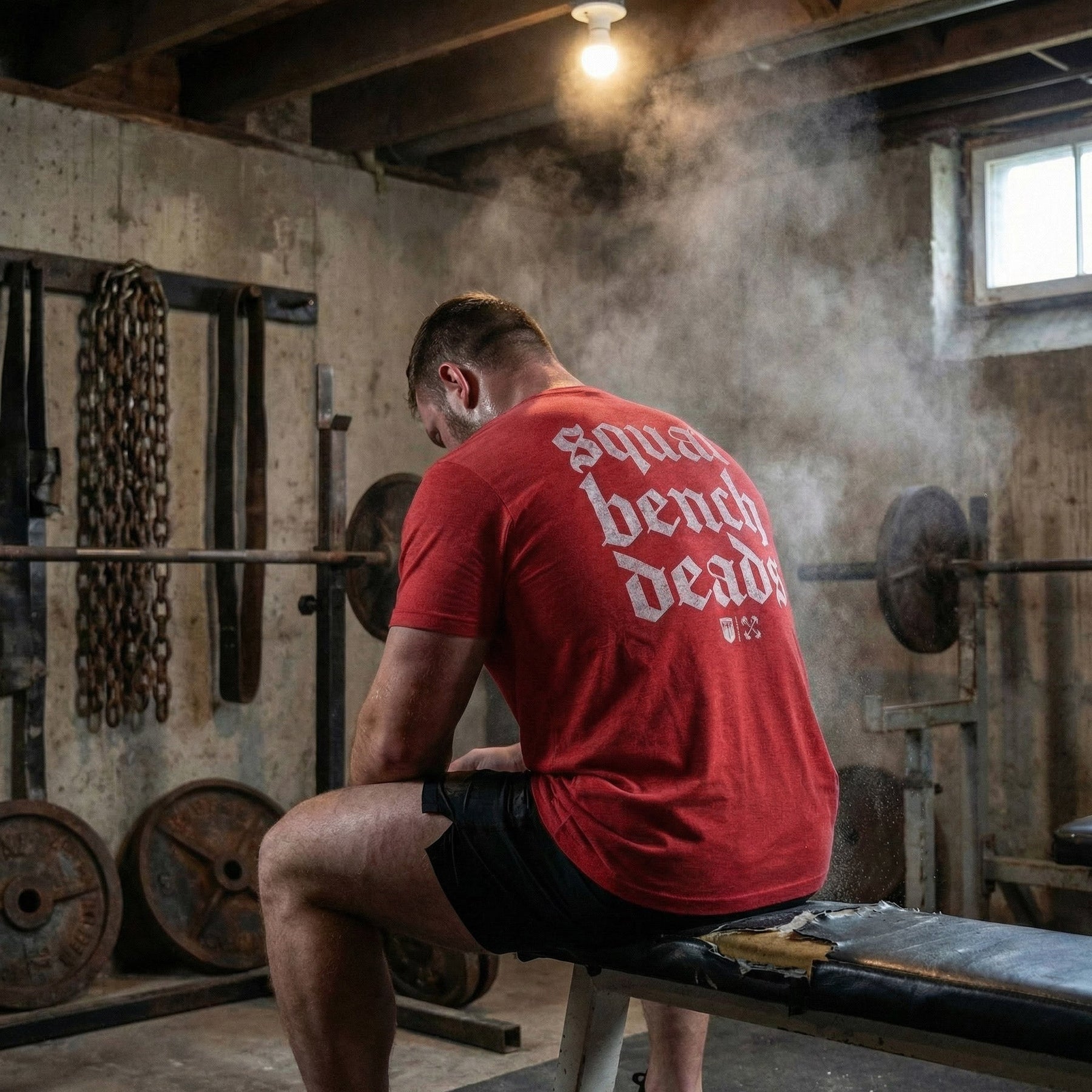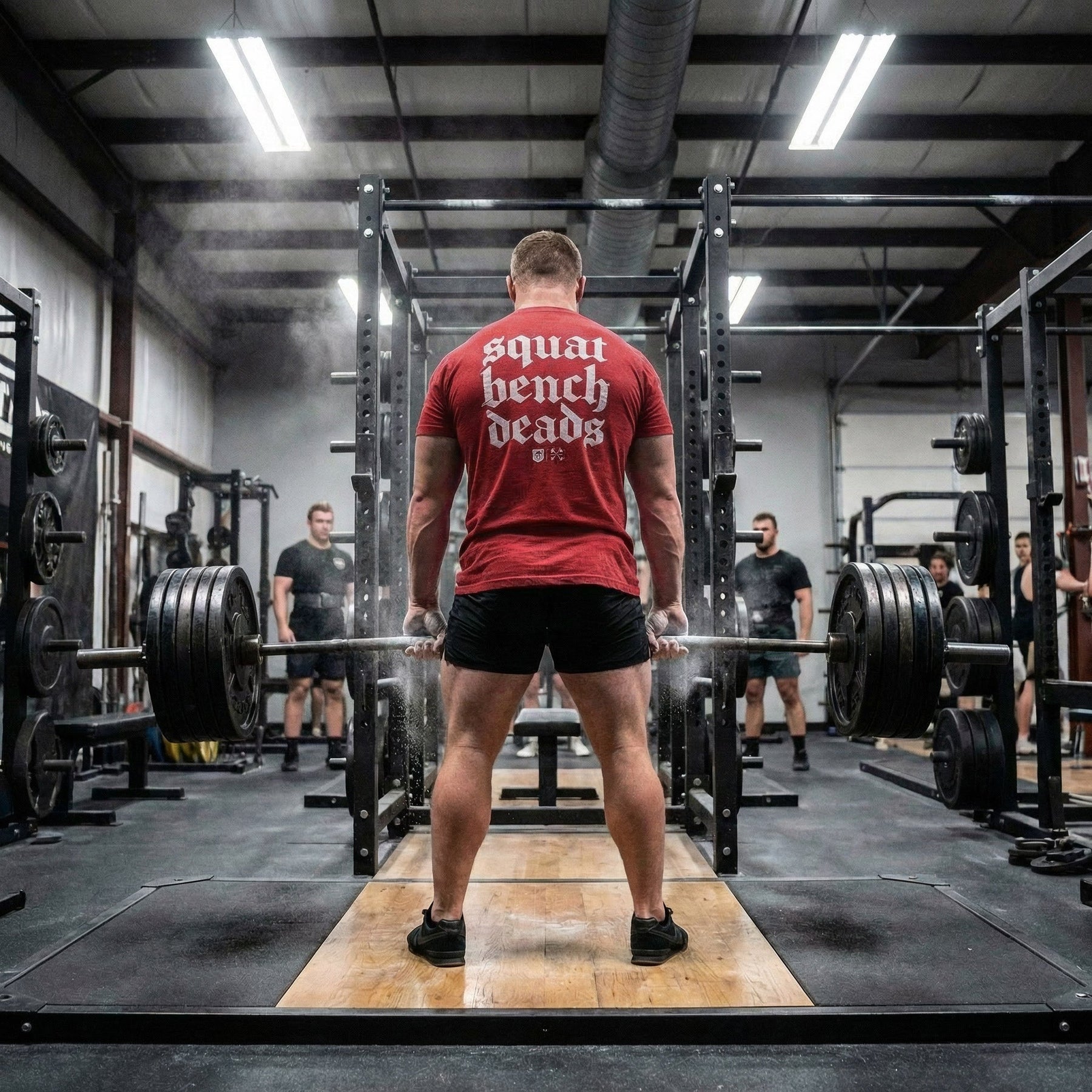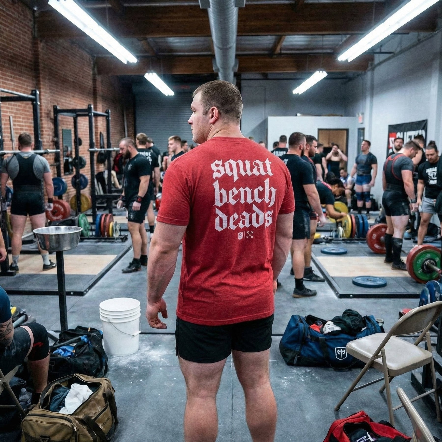 This isn't your average gym shirt. It's a 60/40 cotton-poly blend, soft enough for all-day wear, tough enough to handle heavy training sessions. Hand-printed in Tennessee by a competitive powerlifter who knows what it takes under the bar.