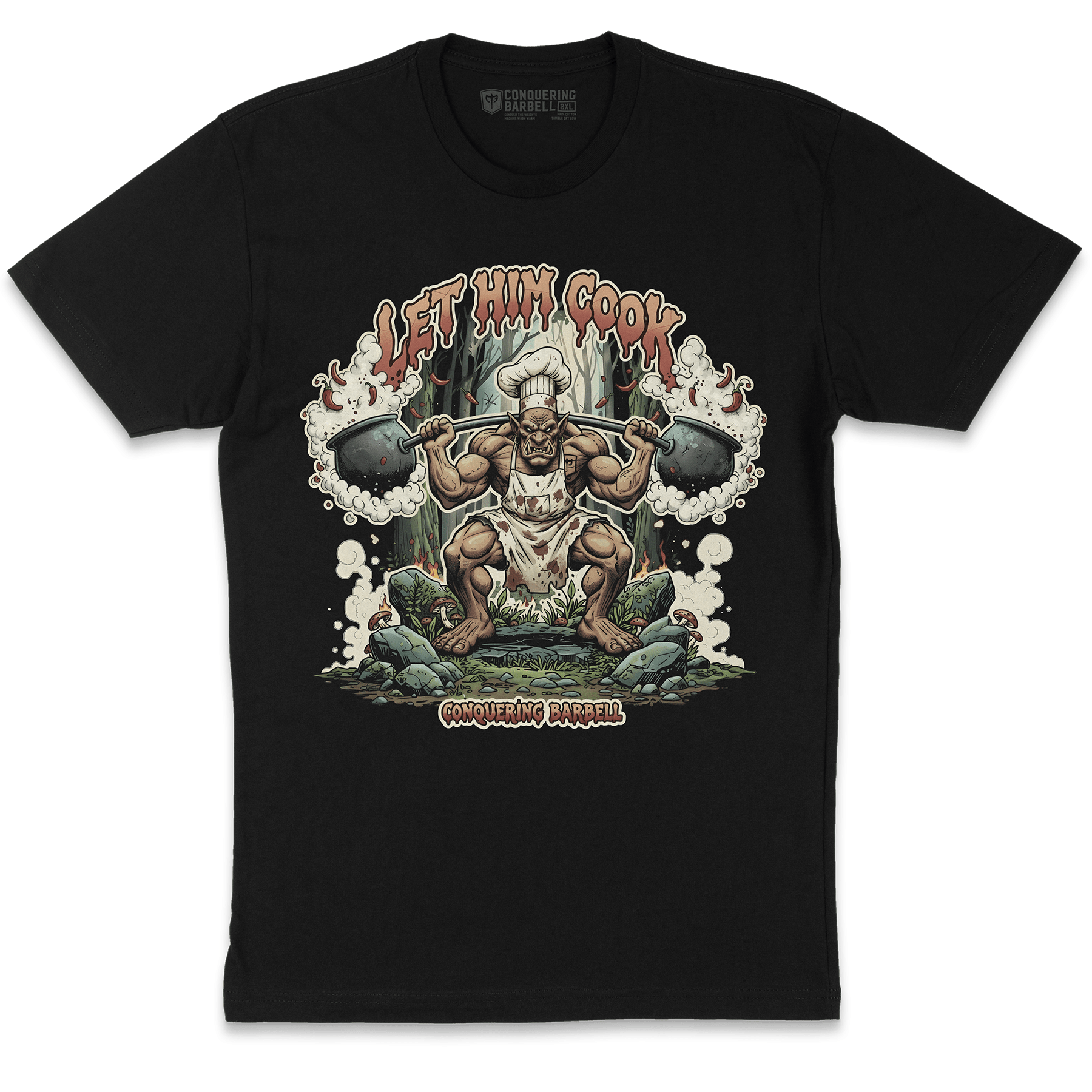 Let Him Cook! - Troll Squat - on Black Tee - Conquering Barbell