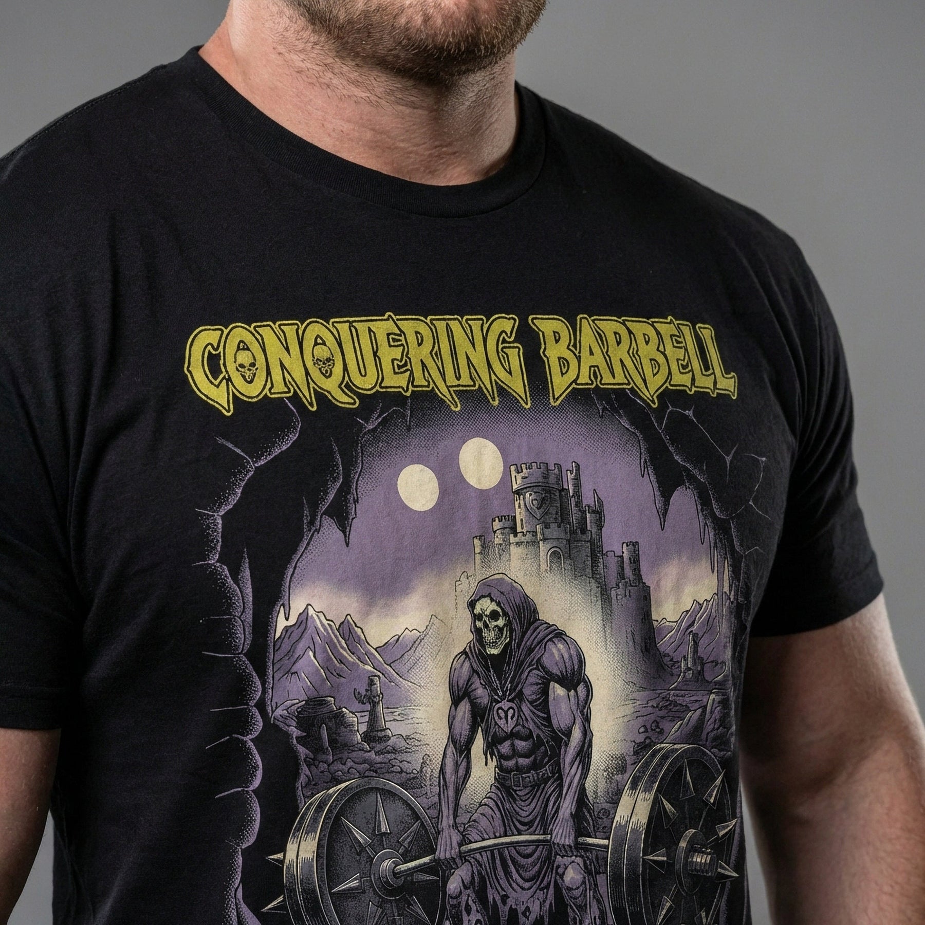 Conquering Barbell Eternal Deadlift t-shirt—skeletal warlord deadlifting before a fortress with ‘Conquer the Weights’ banner on black tee
