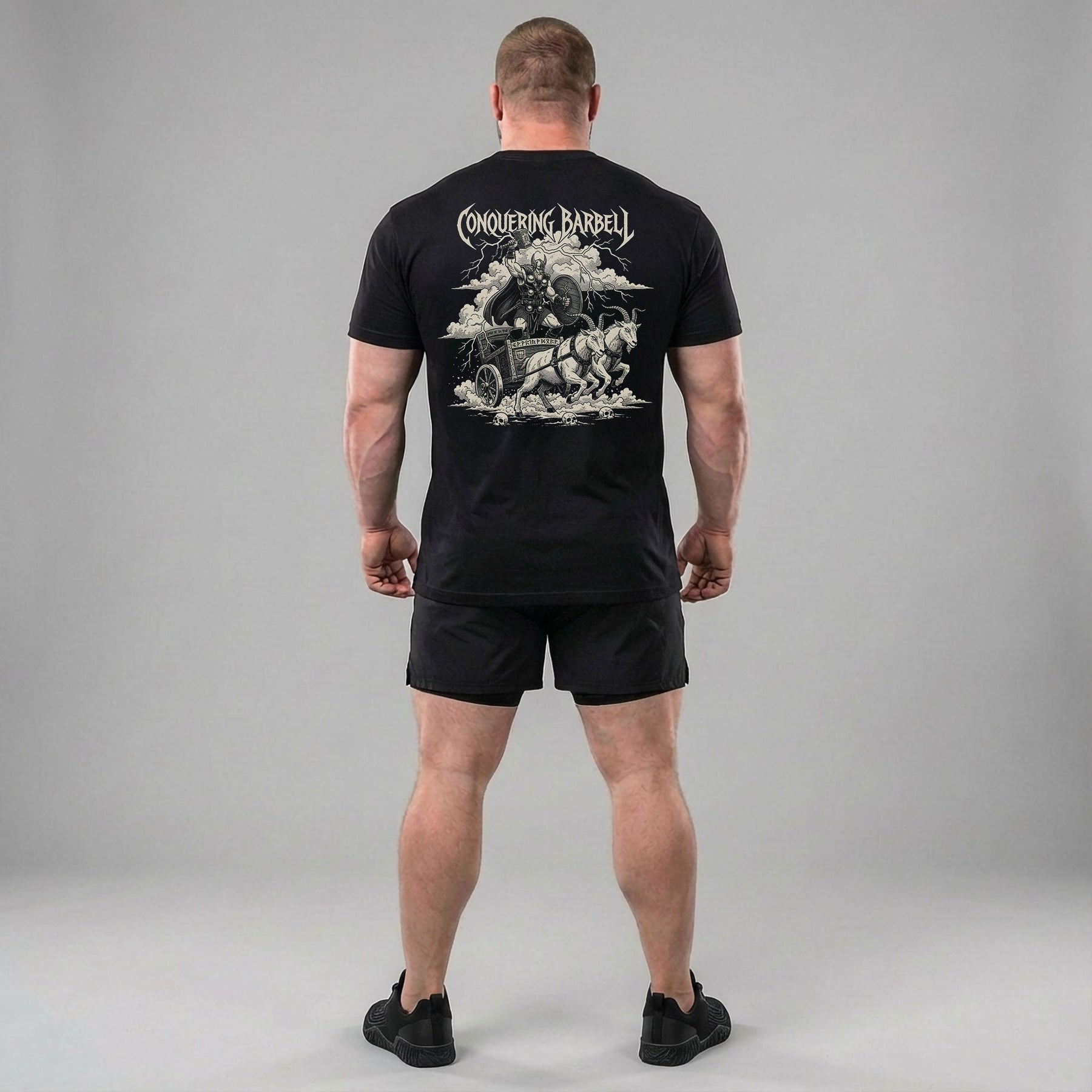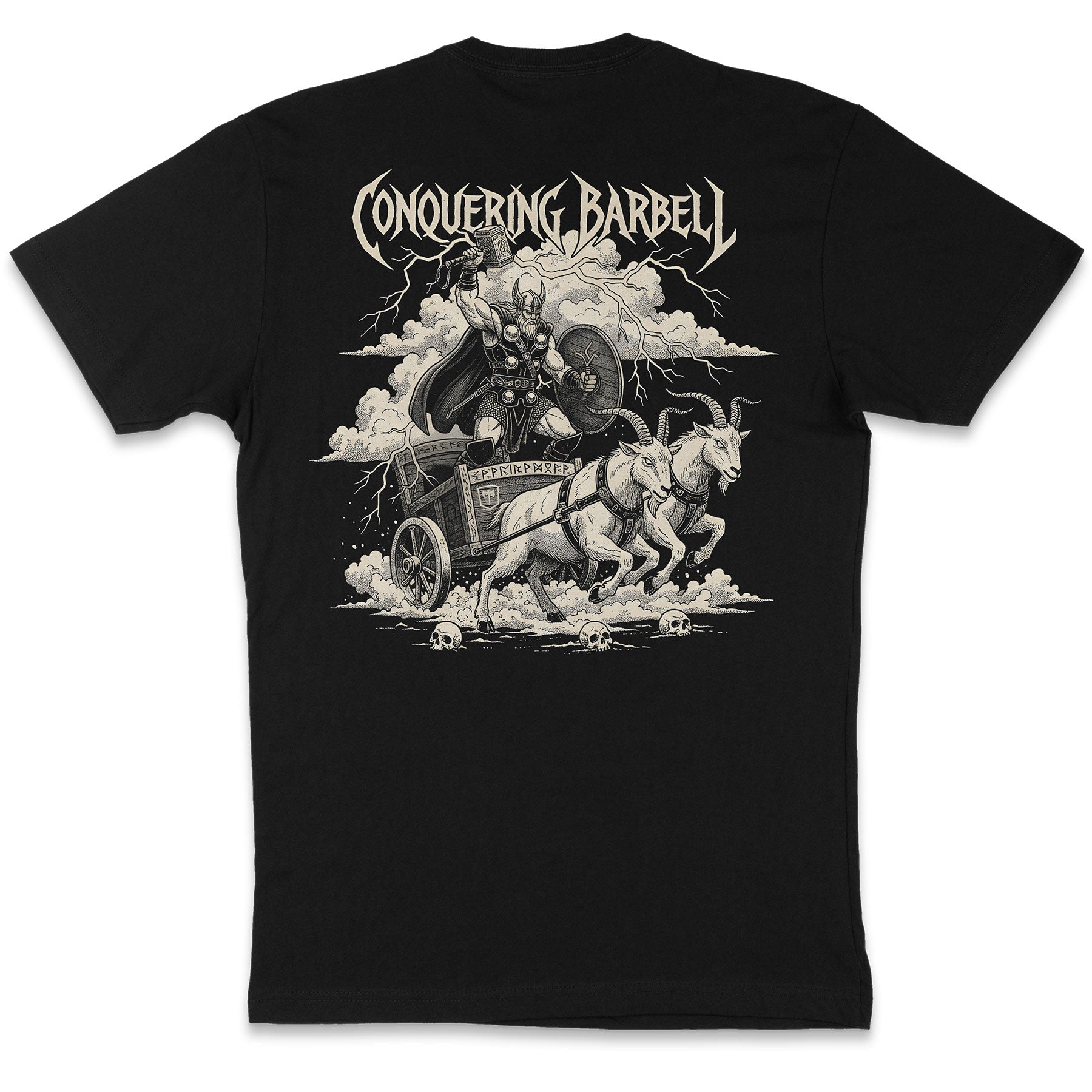 Design: Thor-inspired chariot with twin goats, hammer aloft, storm clouds and lightning; bold Conquering Barbell mark