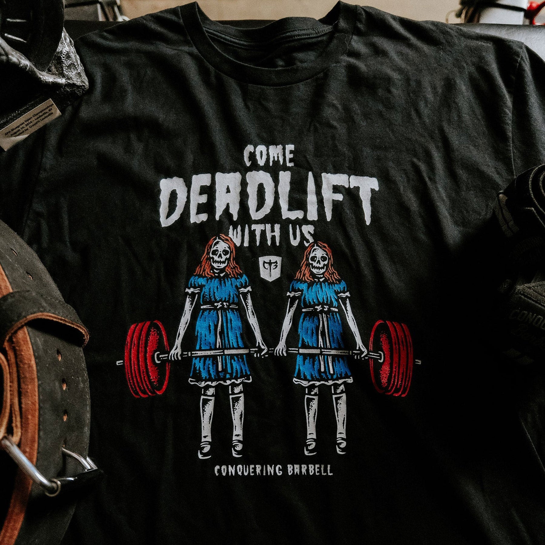 Come Deadlift With Us - on Black tee - Conquering Barbell