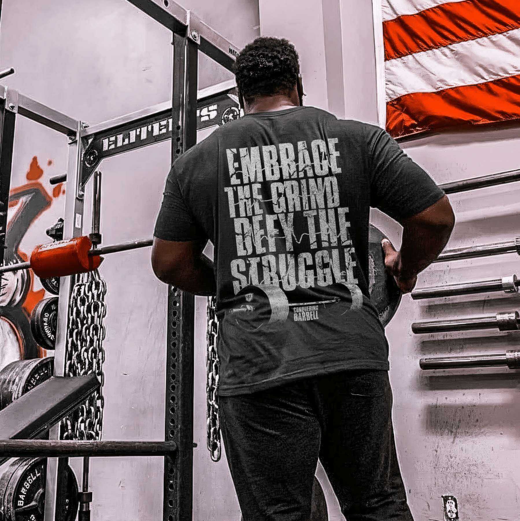 Embrace the Grind, Defy the Struggle - on Black Tee - Conquering Barbell